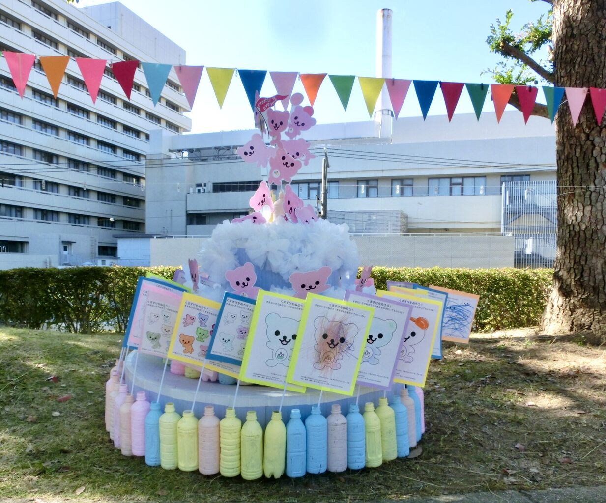 子どもたちが描いたり、色をぬったりしてくれた、色彩楽園キャラクターくますけは旗となり、30周年のお祝いケーキを飾ってくれました。