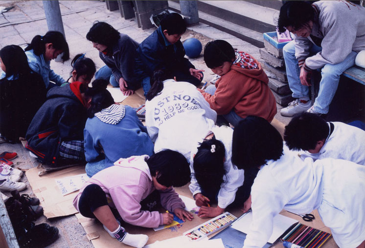 1997年からは神戸市児童相談所(現神戸市こども家庭センター)一時保護所で生活する子どもたちと「おえかきケア」の時間を持ち、1999年には激化した紛争から親族を頼って日本に避難したコソボの子どもたちのケアに関わりました。紛争を経験した子どもたちのダメージはやはり大きく、2001年春に母国に帰国するまで、毎月一緒に絵を描いて過ごしました。